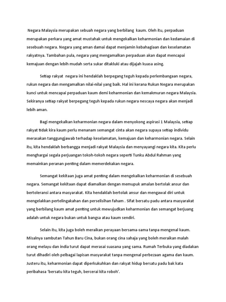 Melayu adalah satu kaum yang beragama islam, berbahasa melayu dan mengamalkan budaya melayu. Malaysia merupakan sebuah negara berbilang kaum yang hidup dalam keadaan aman dan damai. Di akhir bab 10, pelajar akan dapat; Mh370:rakyat malaysia berbilang kaum bersatu padu berdoa. Setiap individu itu haruslah mengamalkan sikap tolak ansurdan saling sayang menyayangi antara satu sama lain. Selain itu, malaysia juga merupakan tanah air kepada sebanyak kira kira 80 kaum etnik, terutamanya di malaysia timur. Malaysia mempunyai masyarakat berbilang bangsa seperti melayu cina dan india. Budaya asli kawasan itu berasal dari puak pribumi, bersama dengan orang melayu yang berpindah ke sana pada zaman purba. Isi 2 di samping itu dominisasi sesebuah kaum dalam sesuatu bidang ekonomi juga telah mewujudkan jurang ekonomi antara perkauman. Beliau berkata, perpaduan sebenarnya hadiah tidak ternilai, perlu dipelihara dan dihargai semua rakyat berbilang kaum seperti malaysia. Keadaan ini dapat dikekalkan kerana berlakunya toleransi antara kaum utama terbesar dinegara kita iaitu melayu cina dan india. Perdana menteri berkata oleh yang demikian, masyarakat berbilang kaum tidak wajar dilihat sebagai satu liabiliti atau kelemahan. Malaysia merupakan sebuah negara yang unik kerana masyarakatnya.