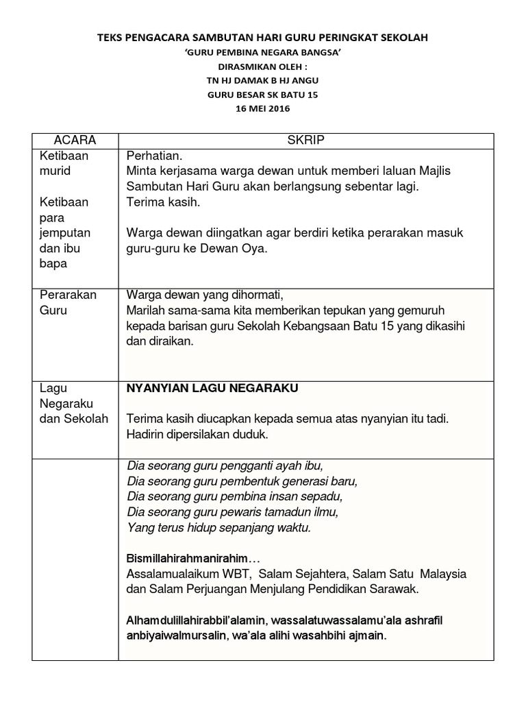 Dengan contoh naskah ini semoga sobatku semuanya dapat menjadikan refrensi ataupun contoh. Contoh teks mc peringatan hari nasional 3. Guru besar untuk menambahkan keserian majlis, ucapan guru besar kita dengarkan. Contoh teks mc peringatan hari kartini mukadaimah arab. Guru selalu mempunyai masalah untuk membuat teks pengacara majlis. Pada malam hari ini, saya ahmad roziqin diberi amanah untuk memandu jalannya acara ini. Yang kami hormati kepada bapak kepala sekolah beserta bapak ibu dewan guru. Hari guru 2018 jatuh pada sehari sebelum umat islam mula berpuasa di bulan ramadhan. Koleksi kumpulan contoh teks ucapan hari guru 2019 wakil murid terbaru yang bisa jadi referensi anda, dengan adanya ucapan hari raya ucapan. Perkenankan saya membacakan susunan acara berikut ini Menyedari masalah ini, sgo dengan murah hati berkongsi teks pengerusi majlis. Teks pengacara penting untuk memastikan program berjalan dengan lancar. Alhamdulillah, telahpun dapat kita kongsikan untuk kegunaan di semua sekolah seluruh malaysia.